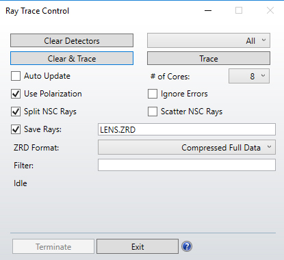 After setting the system up for analysis, a ray trace was conducted (Figure 4). In our simulation, we let the rays split, and saved the results to a ray database (ZRD) file in order to make analysis faster for this particular run. Please note that these files are relatively large, so the compressed version of the complete data is often a good compromise between data density and used storage space. When the ray trace finishes, you can observe the irradiance at the detector plane. The ray trace allows the use of the detector viewer, which will permit different views of the irradiance. A false color view of the irradiance is shown in Figure 5. A linear scale was chosen for the analysis, but log scales are also available. As Figure 5 shows, the issue with the annular drop in irradiance was corrected. This design was chosen for manufacturing.