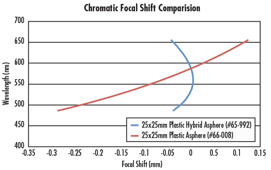 従来の光学レンズで生じる色収差は、光の異なる波長がレンズ光軸上の異なる位置に焦点を結んでしまう現象で、屈折率の異なる光学ガラスから作られた複数枚のレンズを光学アッセンブリ内に用いることで一般に取り除くことができます。しかしながら、色補正する非球面レンズを使って色収差を取り除けば、より少ないレンズ枚数で画像システムをデザインすることができます。レンズ枚数を少なくすることは、光学アッセンブリ全体のサイズや重量を最小化するだけでなく、組立工程も簡略化するため、結果的に低コストで、従来の球面光学素子で組み上げられたアッセンブリ品の性能を凌駕することができます。色収差に関する更なる情報は、色と単色の光学収差をご覧ください。