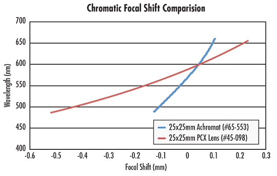 TECHSPEC® ハイブリッド非球面レンズやTECHSPEC® 非球面レンズ、TECHSPEC® アクロマティックレンズといった高性能光学レンズの使用は、上に示したように、光学システムの性能を著しく改善します。高性能な光学レンズを用いることで、スポットサイズと色別焦点シフト量の両方を最小化することができるのです。