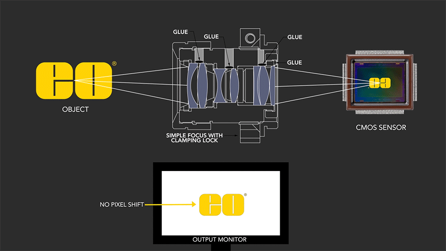 産業用目的の耐久化では、レンズのメカ機構を可変絞りから固定絞りに、またピント調整時にレンズ系が回転しない二重ねじ式鏡筒をシンプルな一重ねじ式とクランプやナット、或いは止めビスといったロック機構に差し替えて簡略化します。この可動パーツの点数削減は、レンズの製造コストを削減するだけでなく、標準的なイメージングレンズに比較して安定性を向上させます。弱い衝撃や振動時において、レンズのピントずれを置きにくくします。しかしながら、過剰に強い衝撃や振動では、鏡筒内に固定された各レンズ素子が芯ずれを起こす可能性があり、それが画像の位置ずれとなって現れます。画像の位置ずれが起きると、物体がイメージセンサー上の不適な位置に像を結ぶことになります (Figure 1 と Figure 2 を参照)。