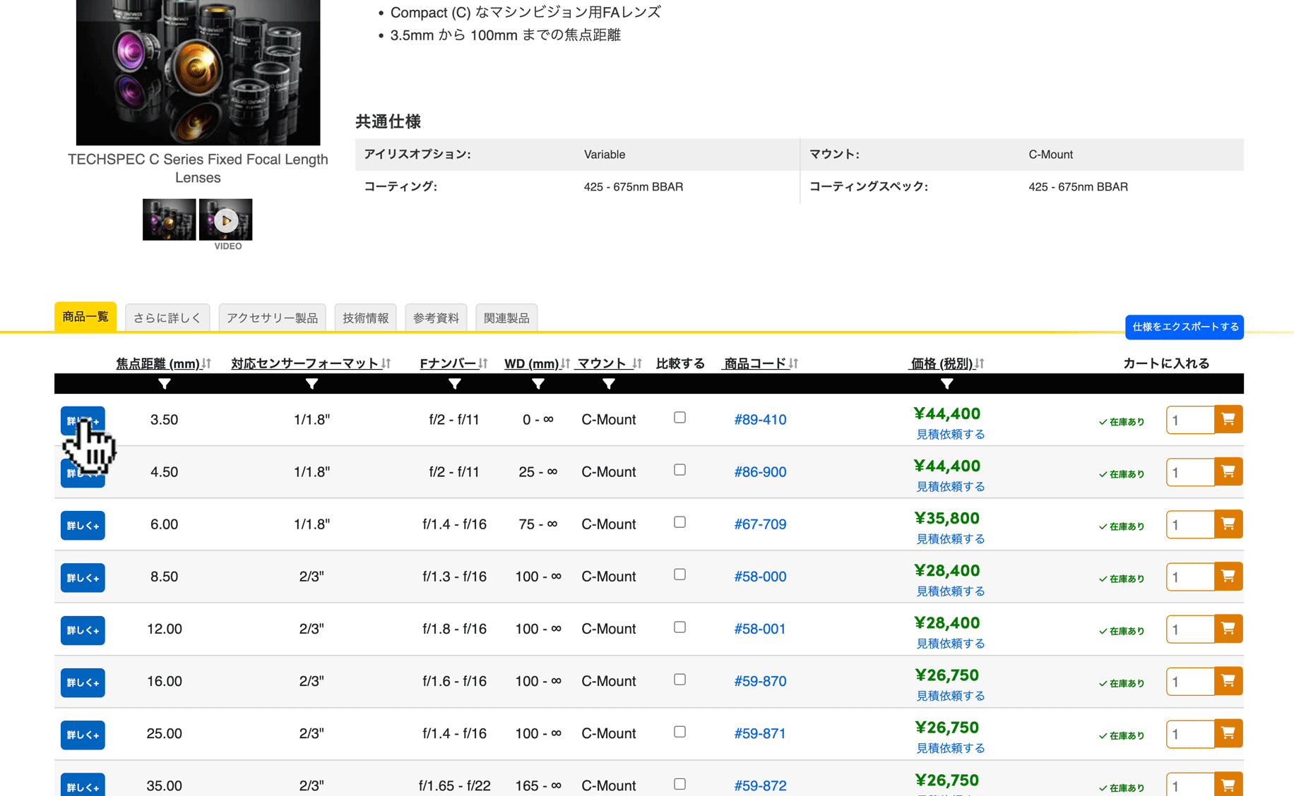 閲覧中の特定の製品に対応する光学マウントを確認することができます。